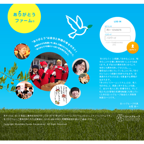 食品加工・販売業:人材教育補助サイト 白ハト食品工業株式会社 様 jQueryサーバー導入支援管理画面WebアプリDrupal(ドルーパル)会員サイトWeb produce https://www.arigatou-farm.net